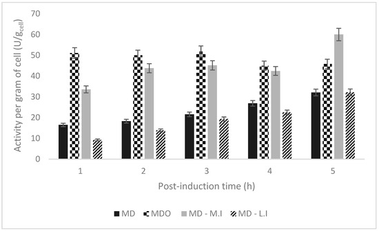 However, upon examining the activity profiles obtained per gram of cell (UI/gcell) post-induction for both the control (MD) and the amino acid induction tests, as well as the MDO (Figure 10), it can be observed that the MDO maintained its expression, reaching maximum activity per cell within the first hour. At the end of the post-induction period (5 h), the activity per gram of cell of L-asparaginase for the D. dadantii double mutant was 32.07 ± 0.00, 60 ± 4.8, 32.14 ± 4.1, and 45.81 ± 1.4 UI L−1 for MD, MD–M.I, MD–L.I, and MDO, respectively. All the tests showed improvement compared to the control, with an increase of 42.87%, 87.1%, and 0.23% in activity per gram of cell for MDO, MD–M.I, and MD–L.I, respectively. The MD–M.I condition was the one that achieved the best activity per gram of cell.