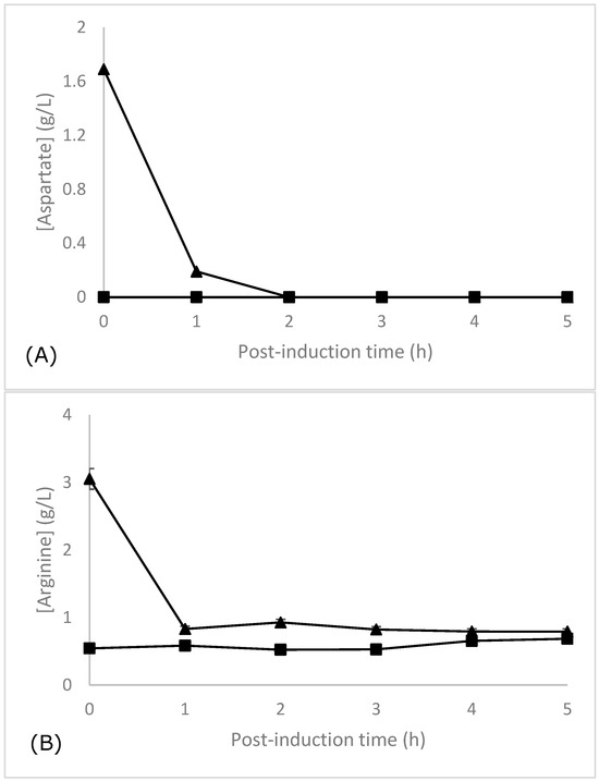 Figure 11. Temporal consumption profile post-induction of (A) aspartate and (B) arginine by E. coli BL21 (DE3). The graphs depict the nutrient consumption dynamics over time post-induction for the MDO strategy (■) and MD–L.I (▲), revealing the metabolic response of the strain to the addition of a synergistic mixture of arginine/aspartate.