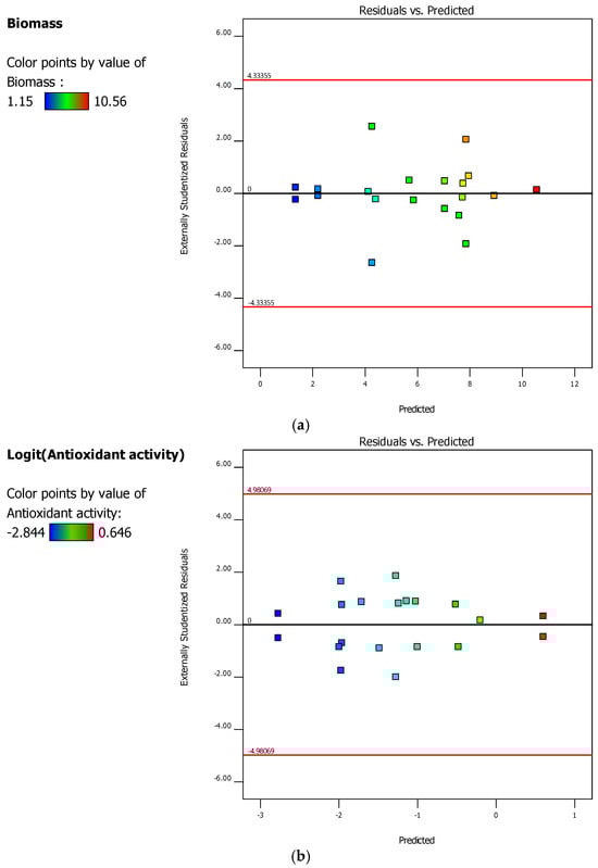 Table 6 shows the summaries of fits and ANOVA results of biomass (y1) and antioxidant activity (y2) responses. Also, the model reductions improve the models of y1 and y2 responses; therefore, the reduced cubic models (RCMs) are used in Table 6. Insignificant model terms were omitted for y1 and y2 responses, excluding the necessary ones to provide a hierarchy.