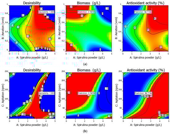 As a result of preliminary studies carried out on the Erlenmeyer scale, high-efficiency results in terms of outputs, such as the viable cell count and both wet and dry biomass in the fermentation process, were obtained in L. rhamnosus 23.2. Therefore, it was decided to use it in the current study. Effects of the parameters such as spirulina powder, aeration, and agitation were investigated on a 3 L bioreactor (Minifors 2, Infors HT, Bottmingen, Switzerland) with a working volume of 1.5 L at batch mode. For all the experiments, the pH was adjusted to 5.8, and the temperature was set to 37 °C. In all bioreactor experiments, 5 g/L of dextrose monohydrate and 2 g/L of inorganic salts were used in the culture medium as carbon source. Spirulina powder was pasteurized at 80 °C for 15 min and then added to the autoclaved bioreactor media. The composition of inorganic salt mix added to the fermentation medium at 2 g/L is as follows: CH3COONa 40%; K2HPO4 20%; C6H8O7·2NH3 15%; MgSO4·7H2O 15%; and MnSO4 10%. Oxygen tension was measured by determining the percentage of dissolved oxygen (DO%) relative to air saturation using an oxygen electrode (InPro 6830; Mettler Toledo, Switzerland). Fermentation time was set at 24 h and inoculation rate at 5%. Aeration rate (0–1 vvm), agitation speed (0–250 rpm), and spirulina powder (0–5 g/L) were used as optimization parameters. Agitation is crucial in overcoming mass transfer resistances in fermentation systems, and this is directly related to agitation speed. Aeration rate is an important process parameter for the growth of aerobic and anaerobic microorganisms [,]. For these reasons, they were selected to optimize fermentation in the study.