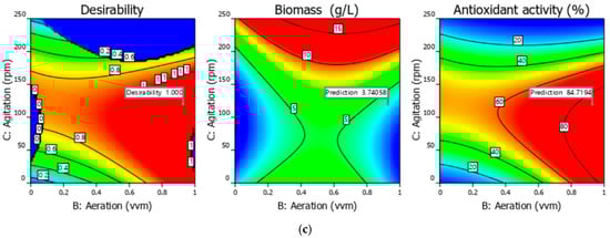 where is the ith coefficient of the biomass regression function. Moreover, d and D represent the vector and matrix of the estimated regression coefficients for the biomass (g/L) response, respectively. Similarly, the estimated antioxidant activity (%) response, , is acquired in the following way.
