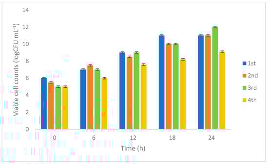 Fermentation was monitored by withdrawing samples from bioreactor productions at different time intervals, and the pour plate method [] was used to enumerate viable cells. L. rhamnosus 23.2 colonies were counted in the MRS agar medium under aerobic conditions. Changes in the viable cell counts were determined as the log CFU/mL.