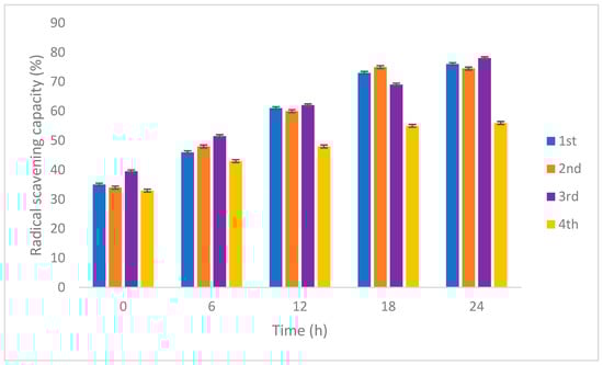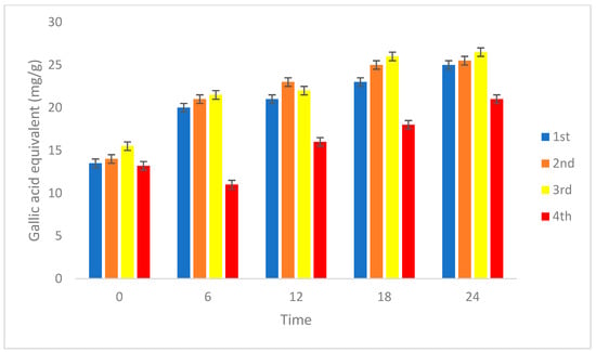 In the present study, DPPH radical scavenging capacity and total phenolic content results were determined similarly in pilot productions. The total phenolic content results are given in Figure 6. The total amount of phenolic compounds in all samples was expressed as mg/L−1 of gallic acid equivalent. The highest total phenolic content of 26.5 mg GAE g−1 was obtained in the third pilot production at 24 h. They were found, 24.5 and 25 mg GAE g−1, first and second studies, respectively. In pilot validation studies, total phenolic content was found to be higher at 18 and 24 h. The total phenolic content without spirulina was found to be lower than that of fermented spirulina studies. Phenolic compounds are considered major contributors to antioxidant capacity []. The total phenolic content of spirulina varies from 5 to about 50 mg GAE g−1, depending on strain, culture, and fermentation conditions [,,]. According to Filannino et al. [], the strain-specific metabolism of phenolic acid derivatives by lactic acid bacteria is strongly dependent on the intrinsic factors of the substrate. Phenolic compounds are one of the main factors responsible for the biological activity, with phycocyanin released from A. platensis biomass and compounds with antioxidant potential. In addition, the total phenolic compound of spirulina may be affected by cultivation conditions such as pH, light, temperature, and the downstream process. Moreover, the fermentation process could have released polyphenols such as gallic acid, converted phycocyanins to phycocyanobilin, or produced other metabolites, enhancing the antioxidant, and this shows the positive effect of using spirulina in an LAB culture medium [,]. Spirulina activates cellular antioxidant enzymes, prevents lipid peroxidation and DNA damage, scavenges free radicals, and increases catalase activity. Thus, it contributes positively to antioxidant and total phenolic substance content [].