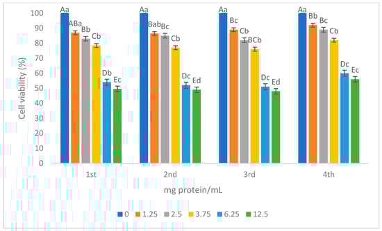Cytotoxic activity was determined for bioactive compounds in each sample, and the modified method described by Cakir-Koc et al. [] was used. Cytotoxicity was determined using Caco-2 adenocarcinoma cells. The Caco-2 cell line was obtained through the American Type Culture Collection (ATCC). Caco-2 cells were fed with 10% (v/v) fetal bovine serum (FBS) (PAN-Biotech, Aidenbach, Germany), 1% (v/v) non-essential amino acids (PAN-Biotech, Germany), and 1% (v/v) penicillin–streptomycin (PAN-Biotech, Germany) inactivated for one h at 56 °C in Dulbecco’s modified Eagle’s minimal essential medium (DMEM) (PAN-Biotech, Germany) containing 4.5 g/L glucose. Experiments were performed at 37 °C and in a 5% CO2:95% air atmosphere. MTT (3-[4,5-dimethylthiazol-2-yl]-2,5 diphenyl tetrazolium bromide) (AFG Bioscience, Northbrook, IL, USA) solution was then added to the wells after the medium parts of the wells were removed. The microplates were incubated at 37 °C for 4 h. After the incubation period, the optical density (OD) at 450 nm was determined using a microplate reader (AMR100 Microplate Reader, Hangzhou, China). The following formula (Equation (7)) was used to determine the number of viable cells.