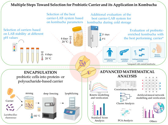This paper explores the influence of different carriers on probiotic survival (Step 1), the optimization of kombucha fermentation parameters (Step 2), and the stability of LAB during storage (Step 3). The optimization process employed advanced mathematical tools—including cluster analysis (CA), Principal Component Analysis (PCA), kinetic modeling, ANN modeling, and multi-objective optimization—to systematically evaluate and refine key parameters related to probiotic survival, kombucha fermentation, and LAB stability. Additionally, mathematical verification was performed to validate the kinetic model- and ANN-predicted values. Lastly, kombucha enriched with probiotic bacteria encapsulated in the optimal carrier was assessed in terms of antidiabetic, antihypertensive, and antihypercholesterolemic potential, as well as sensory characteristics.