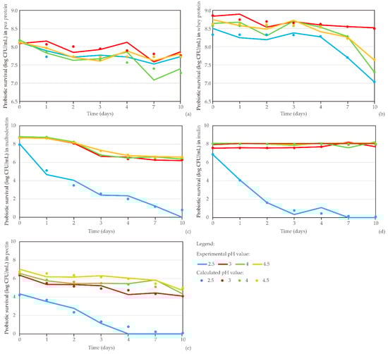 Kinetic modeling of probiotic survival (log CFU/mL) in different carriers: (a) pea protein, (b) whey protein, (c) maltodextrin, (d) inulin, and (e) pectin (points indicate calculated results, while lines present experimentally obtained results).