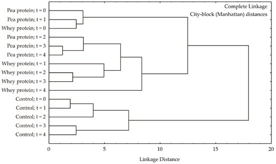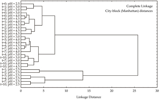 Based on the dendrogram resulting from a hierarchical cluster analysis using complete linkage and city-block (Manhattan) distances (Figure 3), a clear separation of samples into two primary clusters is observed. The first cluster is exclusively composed of samples with a pH of 2.5, while the second cluster encompasses all remaining samples with pH values of 3.0–4.5. This primary division suggests that pH is the dominant factor influencing sample differentiation. Within the second cluster, further sub-structuring is evident. It is noted that samples with pH 4.0 and 4.5 are closely intermixed, indicating a high degree of similarity. In contrast, a temporal trend is discerned within the pH 3.0 subgroup, where samples from earlier time points appear to cluster separately from those at later time points. This suggests that while pH is the primary determinant of sample clustering, temporal changes also contribute to sample variability.