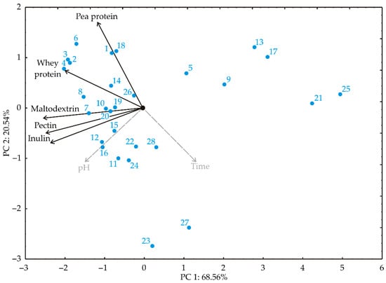 PCA was used to explore the relationships between variables during probiotic survival experiments in different carriers and during the kombucha fermentation process. In the PCA plot (Figure 4), the proximity of spots signifies similarity in patterns [73]. The direction of vectors in the factor space indicates variable trends, while their length represents the strength of the correlation between the fitting value and the variable [74]. Smaller angles between variables denote stronger correlations. The first two principal components demonstrated 89.10% of the total variance in the recorded data. The first PC explained 68.56%, and the second explained 20.54% of the total variance between the collected data (eigenvalues were 3.428 and 1.027 for the first two PCs). The projection of the variables in the factor plane indicated that whey protein (−17.01%, based on correlation), maltodextrin (−27.56%), inulin (−23.68%), and pectin (−26.09%) contributed most negatively to the first principal component (PC1). Pea protein (68.36%, based on correlation) and whey protein (12.93%) contributed positively to the second principal component (PC2), while inulin (−11.64%) contributed negatively to PC2.