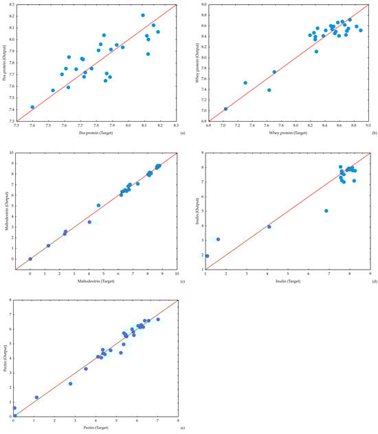 The verification of the ANN models (Table 6), applied to various carriers, reveals a generally good predictive performance, albeit with some variation across different carriers. High r2 values, ranging from 0.694 for pea protein to 0.994 for maltodextrin, indicate a strong correlation between predicted and observed values for most carriers. However, pea protein exhibits a comparatively lower r2 of 0.694, suggesting a somewhat reduced accuracy of prediction for this carrier. Correspondingly, the RMSE values are relatively low, ranging from 0.136 for pea protein to 0.718 for inulin, further supporting the generally good model performance. However, inulin shows a notably higher RMSE, indicating a larger average prediction error for this carrier. The MBE and MPE values, while generally close to zero, show some deviations, particularly for pea protein with an MBE of −0.018 and an MPE of 1.422, suggesting a slight systematic underestimation in this case. The ANN model demonstrates good predictive capability for most carriers, as evidenced by the predominantly high r2 values and low RMSE values. The lower accuracy observed for pea protein and inulin, as well as the minor biases indicated by MBE and MPE values, suggest potential areas for model refinement and further investigation to enhance the overall prediction accuracy and robustness across all carriers.
