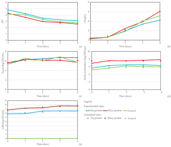 Verification of kinetic models for various parameters (pH, TA, yeasts, AAB, LAB) across different kombucha samples (pea protein, whey protein, control) during fermentation reveals a range of model performances with varying accuracy (Table 8). For the pea protein–LAB-enriched kombucha, pH and TA exhibit exceptional accuracy with χ2, RMSE, and MBE values all at 0.000 and an r2 of 1.000. Yeasts show slightly lower accuracy, with an r2 of 0.989, χ2 of 0.004, RMSE of 0.053, and MBE of 0.000. AAB and LAB present lower accuracy, with r2 values of 0.066 and 0.806, respectively. Specifically, AAB have χ2 of 0.128, RMSE of 0.320, and MBE of 0.000, while LAB show χ2 of 0.025, RMSE of 0.142, and MBE of −0.010. For the whey protein–LAB-enriched kombucha, the pH value maintains high accuracy with χ2 of 0.003, RMSE of 0.050, MBE of 0.000, and r2 of 0.994. TA also shows good accuracy with χ2 of 0.040, RMSE of 0.178, MBE of 0.000, and r2 of 0.993. However, yeasts and AAB exhibit lower accuracy with r2 values of 0.438 and 0.285, respectively. For yeasts, χ2 is 0.055, RMSE is 0.210, and MBE is 0.000, while for AAB, χ2 is 0.131, RMSE is 0.324, and MBE is 0.000. LAB in whey protein shows good accuracy with χ2 of 0.009, RMSE of 0.085, MBE of 0.000, and r2 of 0.943.