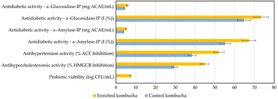 Namely, to ensure that the whey protein carrier did not interfere with enzyme inhibition assays, a series of purification steps was applied to both control and enriched kombucha samples. These included centrifugation, filtration, protein removal (for the enriched sample), and ethanol extraction to obtain a standardized and bioactive compound-rich extract for enzymatic analysis. In the beginning, each kombucha sample was subjected to centrifugation at 5000 rpm for 10 min at 4 °C to separate microbial cells and suspended particles. The resulting supernatant was then passed through a 0.45 µm membrane filter (Whatman No.1 or PVDF membrane, Maidstone, UK) to ensure a clear, cell-free fraction suitable for subsequent assays. Since the enriched kombucha contained protein, an additional trichloroacetic acid (TCA) precipitation step was applied to remove protein content that could interfere with enzymatic activity. To achieve this, 10% (w/v) TCA solution was added to the enriched kombucha (1:10 ratio), resulting in a final concentration of 1% TCA. The mixture was incubated at 4 °C for 30 min to facilitate protein aggregation, followed by centrifugation at 10,000 rpm for 10 min at 4 °C. The clear supernatant was carefully collected and neutralized with 1 M NaOH (pH 7.4) to restore compatibility with enzymatic assays. The neutralized sample was then stored at 4 °C for further processing. To concentrate bioactive compounds, ethanol extraction was performed on both control and enriched kombucha samples. A 1:1 (v/v) ratio of kombucha filtrate to ethanol (99%) was mixed and stirred at room temperature (25 °C) for 30 min to facilitate compound dissolution. The suspension was then subjected to centrifugation at 4000 rpm for 10 min, and the supernatant was collected. To remove ethanol, the supernatant was evaporated under reduced pressure using a rotary evaporator. The resulting dried extract was dissolved in phosphate buffer specific to each enzyme assay (pH 6.8 for α-amylase and α-glucosidase, pH 8.3 for ACE, and pH 7.4 for HMGCR) at a final concentration of 1 mg/mL. The stock solutions were stored at −20 °C until enzymatic inhibition assays were conducted.