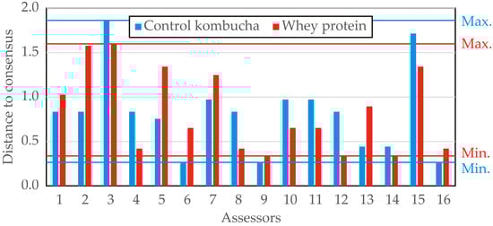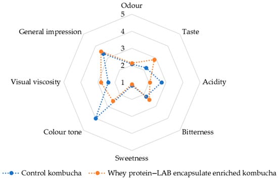 The sensory analysis was conducted in the laboratory for sensory analyses at the Faculty of Technology, University of Novi Sad, Serbia, after approval by the Ethics Committee of Faculty of Technology, Novi Sad, Serbia (Ref. No. 020-8/26). Since there is no standardized approach for the sensory evaluation of kombucha, evaluation techniques and methodologies from the works of Everitt [60], Kim [61], and Ranitović [58] were utilized. All participants approved and signed the informed consent form and evaluated the kombucha samples as trained sensory panelists. Following the average structure of kombucha consumers [62], participation included 4 men (35 to 55 years old) and 12 women (25 to 45 years old). The sensory evaluation was carried out as a blind test—trained participants knew that both served samples were kombucha beverages, but not which one was enriched with whey protein–LAB encapsulates. In brief, eight aroma descriptors (odor, taste, acidity, sweetness, bitterness, color tone, visual viscosity, and general impression) were selected for descriptive analysis, enabling rating from 1 to 5 for each descriptor. A 5-point scale was used to assess the complete evaluation using the following scheme: