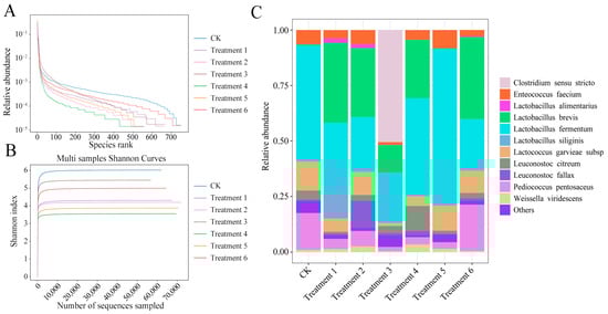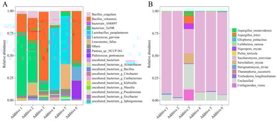 To select the representative microbial additives commonly used in the mountainous pastures of Southwest China, we surveyed 11 pastures across Sichuan and Guizhou provinces. Based on usage frequency and availability, six commercial additives were selected and designated as Treatments 1–6. Treatment 1 was a Qiangxing feed starter (Beihai Qiangxing Biotechnology Co., Ltd., Beihai, China). Treatments 2 and 3 were a Jingyu feed starter and Jingyu straw starter, respectively (Kaifeng Mubo Biotechnology Co., Ltd., Kaifeng, China). Treatments 4 and 5 were Fermentation Gold and a Nanhua feed starter (Henan Nanhua Qianmu Biotechnology Co., Ltd., Zhengzhou, China), while Treatment 6 was a Huaxu yeast powder (Xinxiang Huaxu Trading Co., Ltd., Xinxiang, China). As the microbial compositions of these commercial additives were not clearly disclosed by manufacturers, high-throughput sequencing was performed to determine the taxonomic profiles, which are presented in the Results
