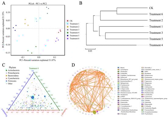 In addition to RDA, multivariate analyses such as PCoA and UPGMA also provided complementary insights into bacterial community patterns. Notably, although Treatment 4 was positioned farthest from the cluster center in the PCoA plot, it was grouped together with Treatments 1 and 6 in the UPGMA dendrogram. This apparent discrepancy reflects methodological differences between ordination-based and clustering-based approaches. PCoA visualizes sample separation based on a limited number of principal coordinates that explain part of the variance, whereas UPGMA considers the entire beta-diversity matrix to represent the overall community similarity. Therefore, Treatment 4 may differ from other groups along dominant axes but still share broader microbial community characteristics with Treatments 1 and 6. This highlights the importance of using multiple complementary analytical methods to gain a more comprehensive understanding of the silage microbiome structure.