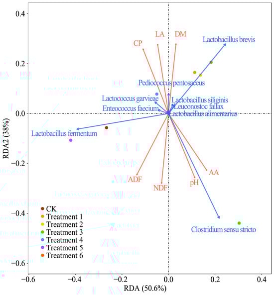 Clostridium sensu stricto and a higher pH—are consistent with the known metabolic functions of these taxa in silage fermentation. These results suggest that, despite potential treatment effects, the microbial indicators identified are ecologically relevant and may play functional roles in the fermentation dynamics. Future studies using factorial experimental designs or simplified microbial models could help disentangle the treatment-based and microbe-specific effects more precisely.