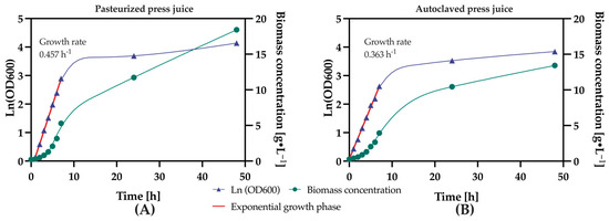 After germ reduction, the diluted press juice was fermented at 30 °C for 48 h with Kluyveromyces marxianus to assess the impact of each germ-reduction method. Both germ-reduction methods led to a colour change from green to brown and flocculent substance formation, indicating the occurrence of the Maillard reaction. The results demonstrated that K. marxianus was successfully fermented in both types of diluted press juice without additional supplements. Notably, the growth rate of K. marxianus (Figure 1) was higher in the pasteurized PJ (0.457 h−1) than in the autoclaved PJ (0.363 h−1). This difference is likely attributable to the higher temperatures (121 °C) used during autoclaving, which may have damaged essential enzymes and vitamins required by K. marxianus for fermentation. Additionally, high temperatures may have caused sugar degradation into furfural and hydroxymethylfurfural (HMF), both known inhibitors of K. marxianus growth [37,38,39]. Furthermore, more extensive Maillard reactions in the autoclaved PJ may have further reduced its suitability as a fermentation medium [40]. After fermentation, the final biomass concentration in autoclaved PJ was 13.15 ± 0.76 g·L−1, a 27.8% reduction compared to 18.20 ± 0.87 g·L−1 in pasteurized PJ. Given these results, pasteurization at 75 °C for 90 min will be used as the sole germ reduction method in future experiments to preserve fermentation medium quality.