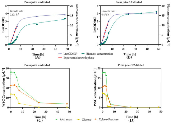 Sugar consumption in the undiluted press juice slowed significantly after 24 h, leaving a residual sugar concentration of 3.57 g·L−1 at the end of the 48 h fermentation period. In contrast, sugar consumption in the diluted press juice decelerated after 10 h but was fully depleted by 24 h, with the total sugar concentration dropping to 0 g·L−1.