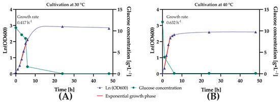 At 30 °C, biomass concentration reached its maximum after 24 h, with a biomass increase of 3.12 g·L−1. In contrast, at 40 °C, growth slowed significantly after 6 h, and the maximum biomass concentration was reached only after 48 h, with a minimal increase of just 0.61 g·L−1. This was due to the complete depletion of available glucose at 40 °C after 6 h, leaving no substrate for further growth. In comparison, at 30 °C, 1.55 g·L−1 of glucose remained available, supporting continued biomass production.