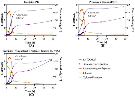 The growth curves, along with biomass concentrations and quantified substrates (Figure 4), indicate similar growth patterns across the three media. After approximately 7 h, all three media shifted from the exponential phase to the stationary phase. The differences in growth rates among the three groups were minor. The pure press juice sample had the highest growth rate (0.490 h−1), whereas the sample supplemented with yeast extract, peptone, and glucose exhibited the lowest growth rate (0.422 h−1). The glucose-supplemented sample exhibited a slightly lower growth rate (0.479 h−1) than the pure press juice sample. For comparison, the growth rate of K. marxianus under different fermentation conditions typically falls within the range of 0.3–0.7 h−1 [44].