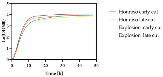 Biomass yield was further evaluated based on actual sugar (glucose, fructose, and xylose) consumption, allowing for the calculation of the biomass yield coefficient for each sample (Table 4). An interesting trend was observed: early-harvested samples produced more biomass but also had a higher initial total sugar content than late-harvested samples. As a result, early-harvested samples had a lower biomass yield coefficient than late-harvested ones. Among the tested varieties, Honroso (late harvest) showed the greatest increase in biomass yield coefficient (25.1%), followed by Explosion (late harvest) with a 17.8% increase. In contrast, the YM-medium control group had the lowest efficiency, with a biomass yield coefficient of just 0.510 g·g−1. This may be because the YM medium contains only glucose, while the press juice medium also provides fructose and xylose, both metabolized by K. marxianus. Limited sugar availability in the YM medium likely constrained biomass formation, reducing both total biomass yield and its yield coefficient.