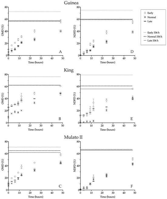 and ···), normal (× and - -), and late (- and —) from rumen of cattle. Error bars indicate SEM; lines in each panel indicate values for 336 h incubation.