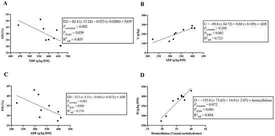| D (g/kg DM) = −155.8 (±73.65) + 14.9 (±2.07) × hemicellulose | 0.938 | 0.864 | 0.072 | <0.001 |