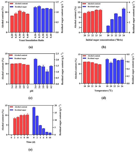 Fermentation time was tested at 0, 2, 4, 6, 8, and 10 days (22 °C, 0.3 g kg−1, pH 3.8, 20 °Brix). Alcohol content and residual sugar levels were analyzed at each timepoint to profile fermentation kinetics and determine the optimal duration.