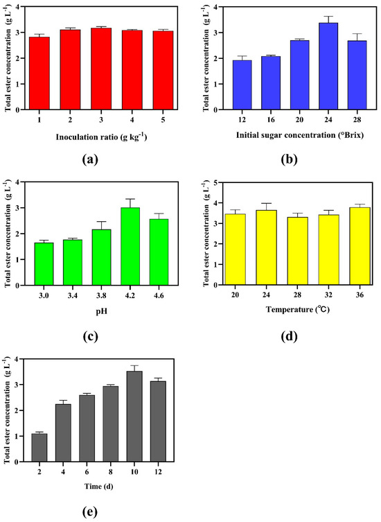 Single-factor optimization of Monascus purpureus fermentation parameters for ester biosynthesis: (a) inoculation ratio, (b) initial sugar concentration, (c) pH, (d) temperature, (e) duration.