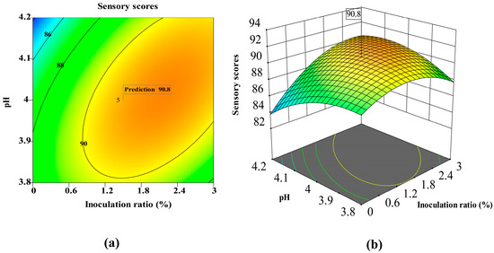 This model highlights that sensory scores are driven by inoculation ratio (A) and its synergistic interaction with pH (AC). Notably, neither temperature (B, p = 0.9760) nor pH (C, p = 0.2874) alone had significant linear effects, emphasizing the importance of multifactorial optimization. The non-significant lack of fit (p = 0.9741) confirmed the model’s robustness.
