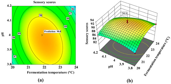 Response surface methodology (RSM) analysis of sensory score: interaction between fermentation temperature and pH: (a) contour plot, (b) 3D surface plot.