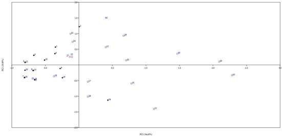 Principal Component Analysis (PCA) was applied to the dataset, considering the fermentative capacities of the yeast isolates across a range of carbohydrates (glucose, fructose, galactose, sucrose, raffinose, lactose, and maltose), β-glucosidase enzyme production, and their tolerance to different stress conditions (pH, ethanol, and temperature). This analysis aimed to identify underlying patterns and classify the yeast strains based on these multifaceted characteristics. The first two principal components (PC1 and PC2) accounted for 34.63% and 20.80% of the total variance, respectively, providing a significant representation of the data’s variability (Figure 1).