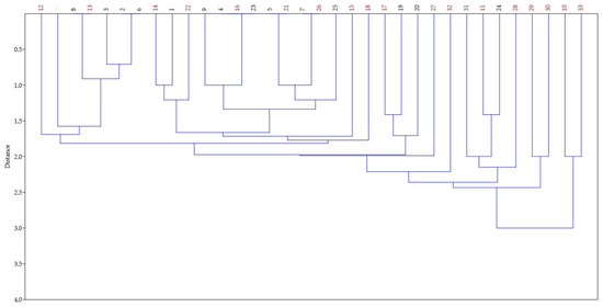 The dendrogram of Figure 2, constructed using Ward’s method and Euclidean distance, visually corroborated the groupings suggested by the PCA while also revealing similarities between isolates. Based on PCA and corroborated by dendrogram analysis, four distinct groups of yeast isolates were identified based on their functional characteristics: (i) Group 1 (pH/ethanol tolerant): Strains 11, 13, 15, 16, 30, 31, and 33, located towards positive PC2, exhibited high tolerance to a wide pH range and varying ethanol concentrations, with diverse carbohydrate fermentation profiles; (ii) Group 2 (Efficient carbohydrate fermenters): Strains 12, 18, 20, 25, and 28, located towards negative PC2 and positive PC1, demonstrated strong fermentative capacity of various carbohydrates and formed a clear cluster in the dendrogram, suggesting lower tolerance to acidic pH; (iii) Group 3 (Diverse characteristics): Strains 1, 2, 3, 5, 9, 19, 21, 22, 23, 26, and 27 displayed variable PC1/PC2 values and growth at elevated temperatures, with a more dispersed pattern and smaller subgroups in the dendrogram, indicating a tolerance characteristic to different pH; (iv) Group 4 (Limited carbohydrate fermentation and pH tolerance): Strains 6, 14, 21, 22, and 32, located towards negative PC1, showed limited fermentation of tested carbohydrates but exhibited some tolerance at different pH.