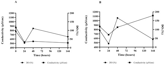 Dissolved oxygen (DO %) and conductivity (µS/cm) variations in the mead produced with Saccharomycopsis fibuligera strain (A) and in the mead produced with S. cerevisiae and Saccharomycopsis fibuligera (B).