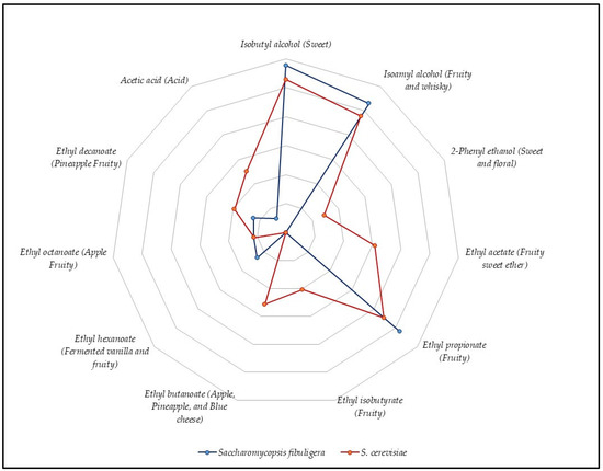 Comparing volatile compounds produced during alcoholic fermentation by Saccharomycopsis fibuligera and S. cerevisiae (Table 3), we found significant differences. The Saccharomycopsis fibuligera strain exhibited limited fermentation of honey and must and did not produce ethanol, unlike the commercial S. cerevisiae strain.