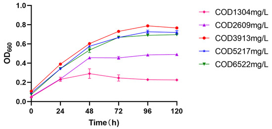 As demonstrated in Figure 2, strain DYYC01 exhibited concentration-dependent growth kinetics in SCBB media across a COD gradient (1304–6522 mg/L). Suboptimal growth was observed at 1304 mg/L COD. Progressive enhancement occurred at elevated COD levels, peaking at 3913 mg/L COD (OD660 = 0.831). Subsequent COD increases (5217–6522 mg/L) induced growth inhibition (ΔOD660 = −0.150). Temporal analysis revealed consistent entry into the stationary phase at 96 h across all groups, indicating COD-independent transition to nutrient limitation. Based on growth optimization, the 3913 mg/L COD medium with 4-day incubation was selected as the optimal cultivation regime for subsequent experiments.