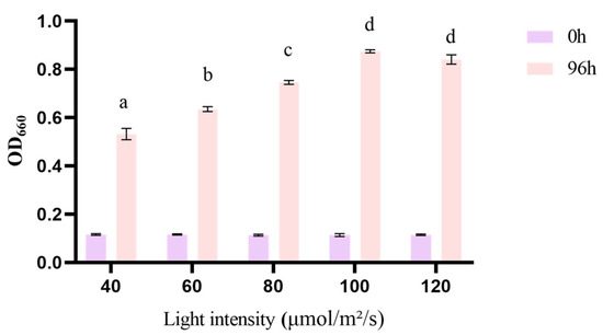 OD660 obtained for strain DYYC01 under different irradiance conditions. Different lowercase letters indicate significant differences between groups (p < 0.05).