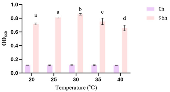OD660 obtained for strain DYYC01 at different temperatures. Different lowercase letters indicate significant differences between groups (p < 0.05).