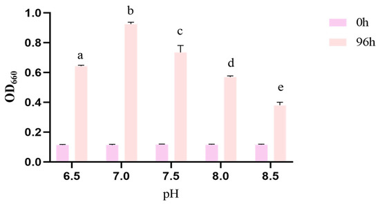 The acid-base homeostasis analysis revealed that strain DYYC01 maintained functional viability within pH 6.5–8.5, though with significant metabolic divergence. As quantified in Figure 5, suboptimal growth occurred at pH 6.5, indicative of proton motive force dissipation. Physiological optimization emerged at circumneutral pH (7.0–7.5), peaking at pH 7.0 with maximal biomass yield (OD660 = 0.924). Alkaline stress (pH ≥ 8.0) induced progressive metabolic inhibition. Therefore, a pH value of 7.0 was ultimately chosen as the optimal pH condition for cultivating strain DYYC01.