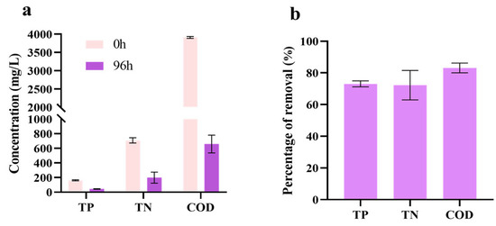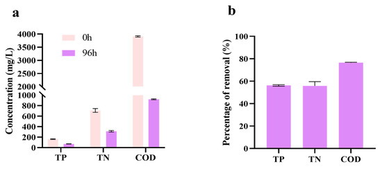 The treatment efficiency of strain DYYC01 on sea cucumber boiling broth under optimal conditions. (a) Variations in the concentration of TP, TN, and COD; (b) percentage of removal.
