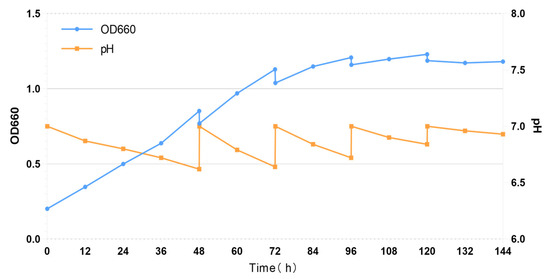 The growth kinetics of strain DYYC01 in the fermenter exhibited characteristic exponential-phase progression (0–96 h) followed by a stationary-phase transition, mirroring the growth pattern observed in batch cultivation (Figure 7). After 144 h of fed-batch operation, the final OD660 reached 1.2, representing a 29.8% enhancement compared to batch culture maxima (0.924), demonstrating the efficacy of controlled nutrient supplementation in overcoming substrate limitation and sustaining exponential-phase progression. Concurrently, progressive acidification (ΔpH = −0.38 over 48 h) was observed during cultivation. Because acidification demonstrated inhibitory effects on strain growth (Figure 5), maintenance of pH homeostasis at 7.0 through controlled neutralization was proved critical for sustaining optimal growth.