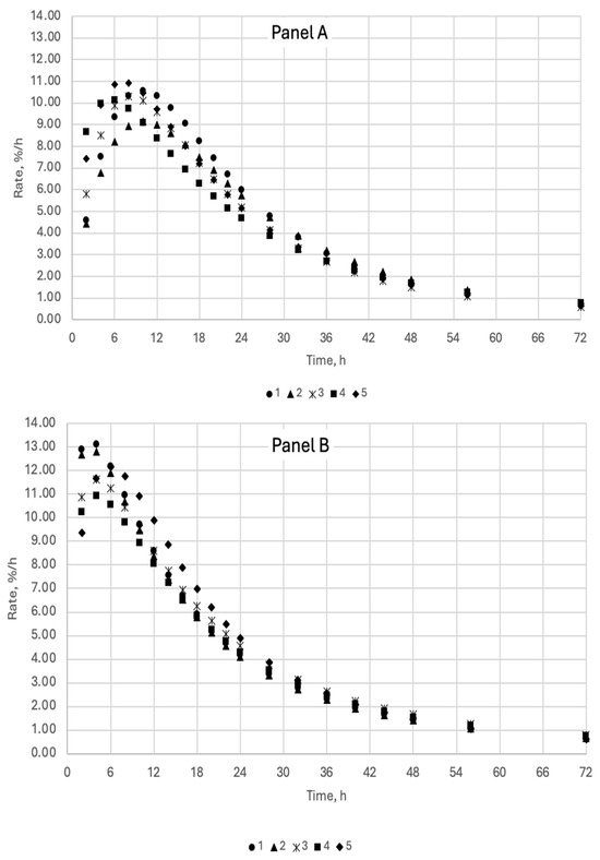 Figure 1 and Figure 2 show the gas production profiles and fermentation rates over time for the fresh and ensiled material, Panel A and Panel B, respectively. The curves resulted from the average values recorded at each time point for every fermentation bottle, providing a comprehensive representation of the overall fermentation dynamics. The overall shape of the gas production curves remained relatively consistent between fresh and ensiled samples, indicating that the general fermentation pattern was not drastically altered by the ensiling process. The fermentation rate closely followed the trends in gas production, with minor variations among the different maize varieties. In general, fresh samples exhibited a slightly higher fermentation rate compared to their ensiled counterparts. This difference can be attributed to the presence of soluble sugars in the fresh material, which serve as readily available energy sources for microbial fermentation.