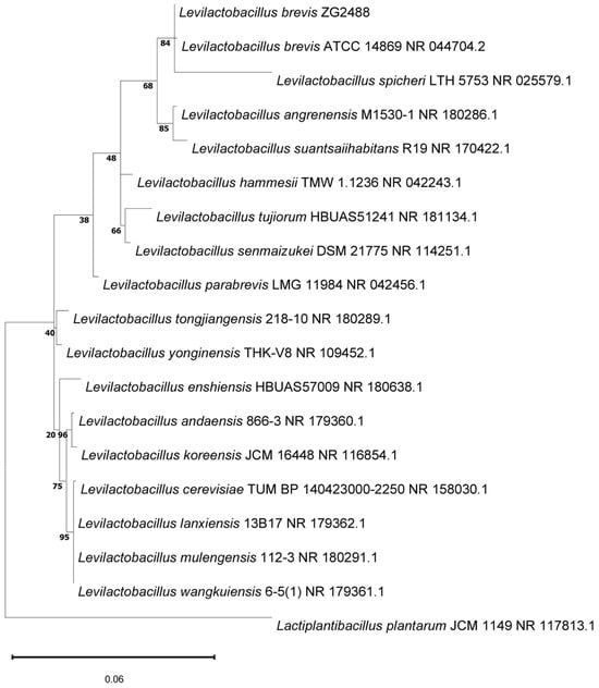 L. brevis ZG2488 was isolated from healthy human feces within 1 year of collection. The participant was screened to ensure the absence of clinical or subclinical diseases, they had not received antibiotics or probiotics, and they had passed a medical examination. Written informed consent was obtained from the participant prior to this study. The strain was identified through the amplification of the 16S rRNA gene using universal primers (27F and 1492R) [], followed by a BLAST+ 2.15.0 search in the NCBI database. The sequences of L. brevis ZG2488 and other representative strains were aligned using the computer software MEGA_11.0.13_win64, and a phylogenetic tree was constructed based on the 16S rRNA gene sequence utilizing the maximum likelihood method [].
