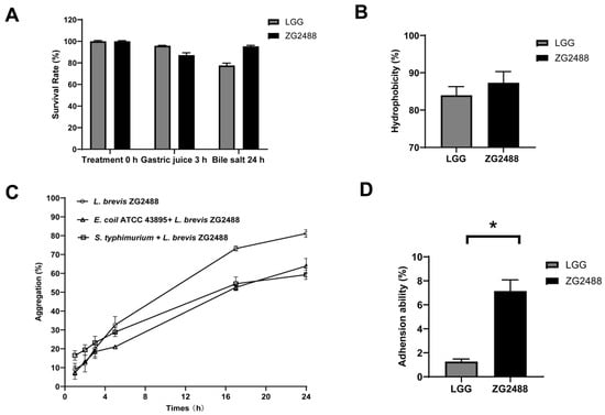 Due to the species-specific and even strain-specific effects of probiotic bacteria on the host’s health, it is essential to evaluate the probiotic potential of wild or novel strains. Therefore, the probiotic characteristics of L. brevis ZG2488 were assessed, including its tolerance to artificial gastric juice and bile salts, hydrophobicity, auto-aggregation, co-aggregation, adhesion, and antimicrobial activity.