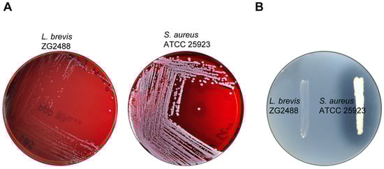 L. brevis ZG2488 and Staphylococcus aureus were seeded onto Columbia agar plates supplemented with sheep blood and incubated for 48 h and 24 h, respectively, at 37 °C under aerobic conditions. Staphylococcus aureus served as a positive control. Following incubation, the presence of clear colorless zones around the colonies was assessed as β-hemolysis, indicating hemolytic activity.