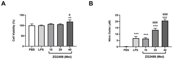 The immune-stimulating effects of L. brevis ZG2488 on RAW 264.7 cells. (A) The cell viability was assessed using the MTT assay, and (B) the stimulatory effect on nitric oxide production was evaluated by the Griess reaction system after 24 h of treatment with varying doses of L. brevis ZG2488 (Moi = 10, 20, and 40). Statistical significance was determined by ** p < 0.01, and *** p < 0.001 compared with the PBS group, and # p < 0.05 and ### p < 0.001 compared with the LPS group.