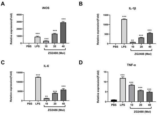 L. brevis ZG2488 evoked proinflammatory genes for immune stimulation in RAW 264.7 cells. The mRNA expression levels for (A) iNOS, (B) IL-1β, (C) IL-6, and (D) TNF-α were quantified using qRT-PCR and normalized to β-actin expression. Statistical significance was denoted by ** p < 0.01, and *** p < 0.001 compared with the PBS group.