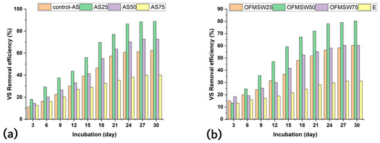 The removal of VS (%) during incubation: BMP tests for (a) SCG-AS and (b) SCG-OFMSW.