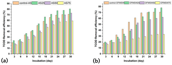 The TCOD removal efficiency during incubation tests. (a) BMP tests of SCG-AS and (b) BMP tests of SCG-OFMSW.