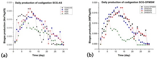 Daily biogas production obtained from the BMP-MM test of (a) SCG-AS and (b) SCG-OFMSW.