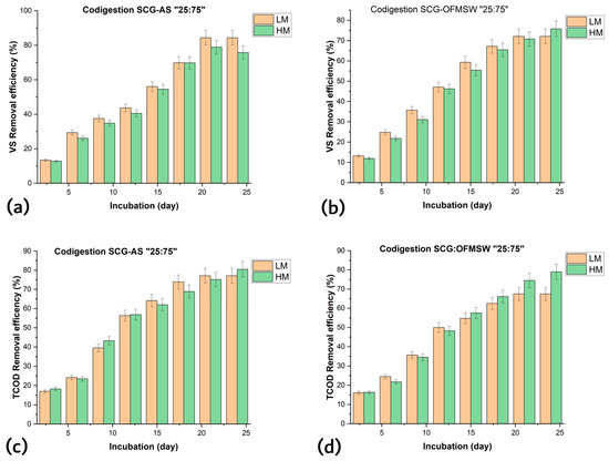 The BMP-AM bioreactors required 22 days to incubate SCG-AS digestion and 24 days to incubate SCG-OFMSW. This is due to the required time for bacterial activity to stop and the process to stabilize. Due to the nature of the substrate and its ability to recover after each pH adjustment, it is evident that the OFMSW substrate required a longer incubation period when compared with the SCG-AS substrate [61]. As revealed in Figure 5 for AS and OFMSW, the VS removal efficiency during incubation was 78.89% and 75.775% through HM mode testing and 84.34% and 72.06% through LM mode testing, respectively. In general, as shown in Figure 5a–d the co-digestion SCG-OFMS showed the highest performance with respect to the removal efficiency of VS and TCOD and a higher performance in SCOD conversation rate. On the other hand, co-digestion showed a high and acceptable removal efficiency of VS and OFMS but at levels that are nevertheless lower than SCG-AS co-digestion.